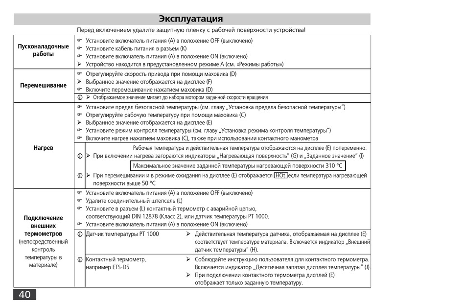 i При перемешивании и в режиме ожидания на дисплее (E) отображается HOt если температура нагревающей