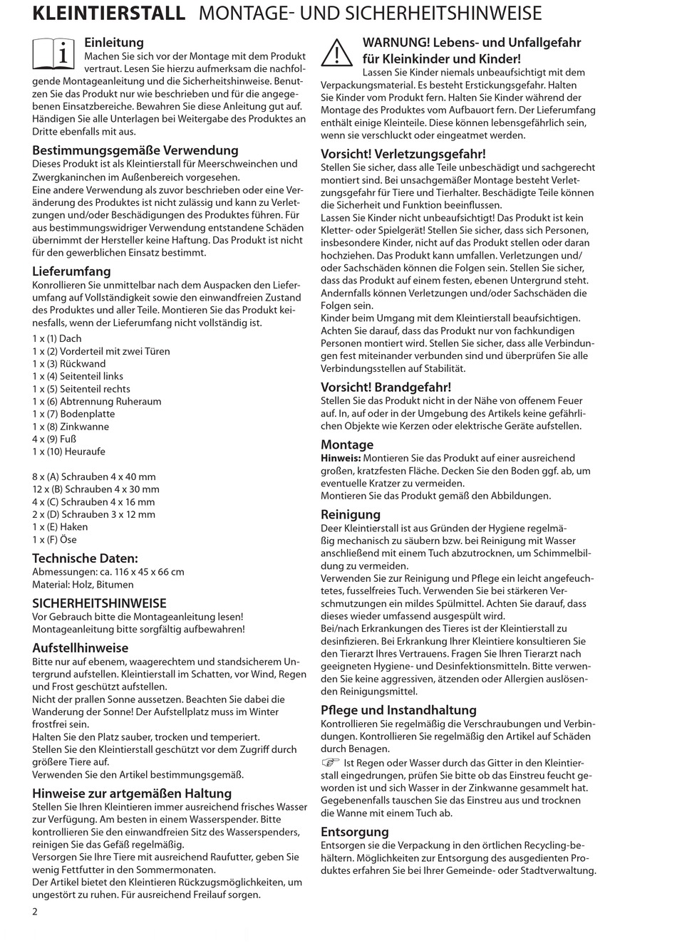 KLEINTIERSTALL MONTAGE- UND SICHERHEITSHINWEISE