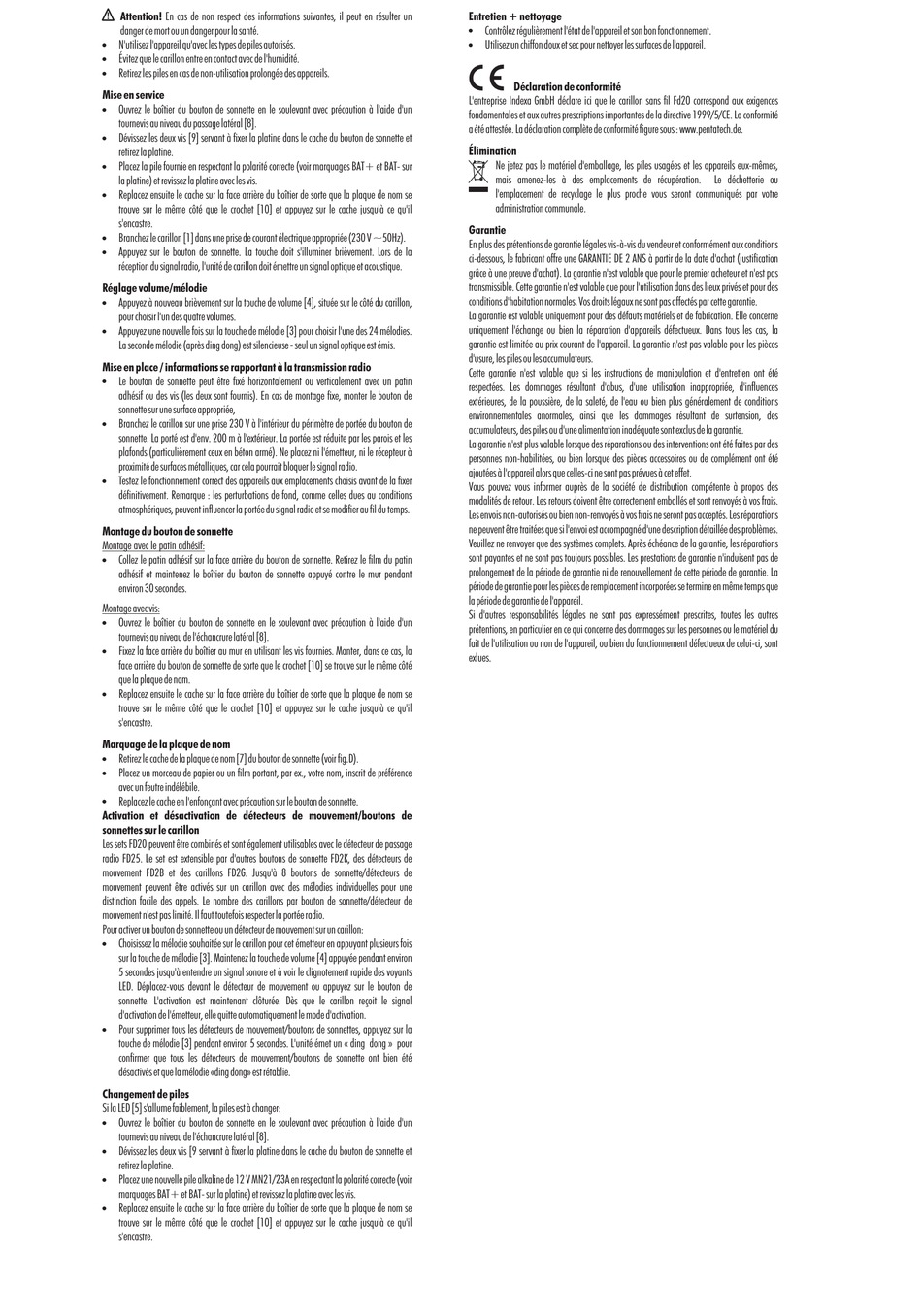 L'entreprise Indexa GmbH déclare ici que le carillon sans fil Fd20 correspond aux exigences