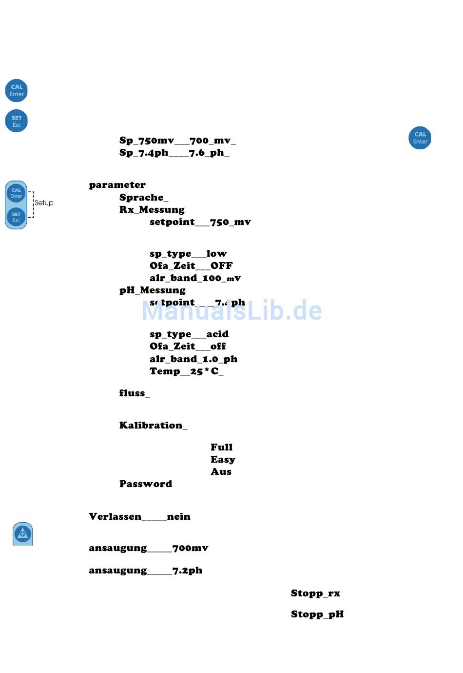 Standardfunktion zum Kalibrieren der Sonde mit der Pufferlösung 7 und 4 und 465 mV für Redox.