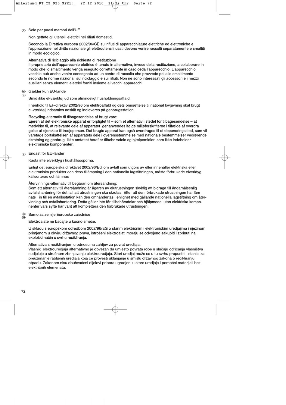 U skladu s europskom odredbom 2002/96/EG o starim električnim i elektroničkim uredjajima i njezinom