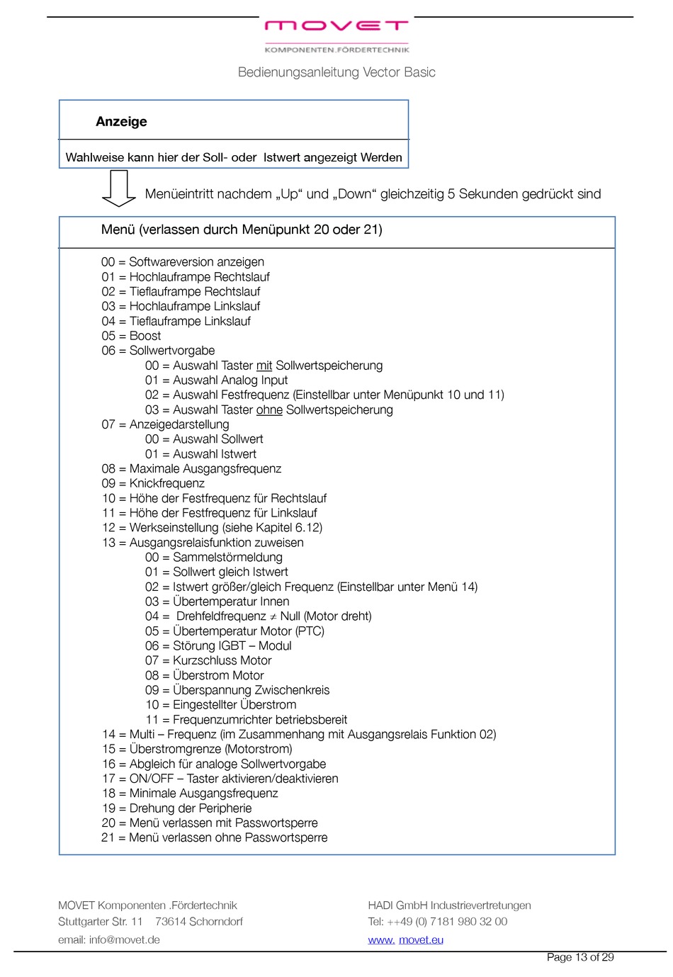 Menü (verlassen durch Menüpunkt 20 oder 21)