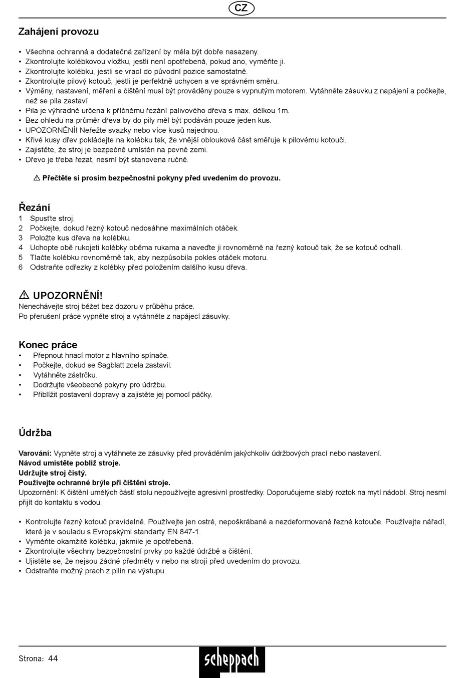 • Zkontrolujte pilový kotouč, jestli je perfektně uchycen a ve správném směru.