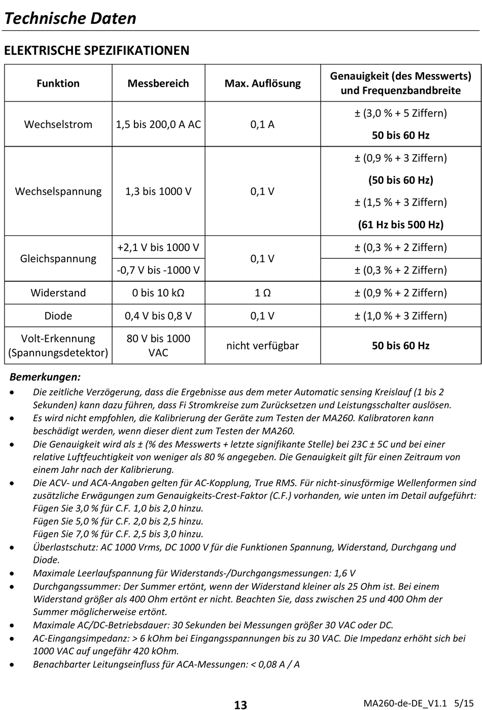 Die ACV‐ und ACA‐Angaben gelten für AC‐Kopplung, True RMS. Für nicht‐sinusförmige Wellenformen sind
