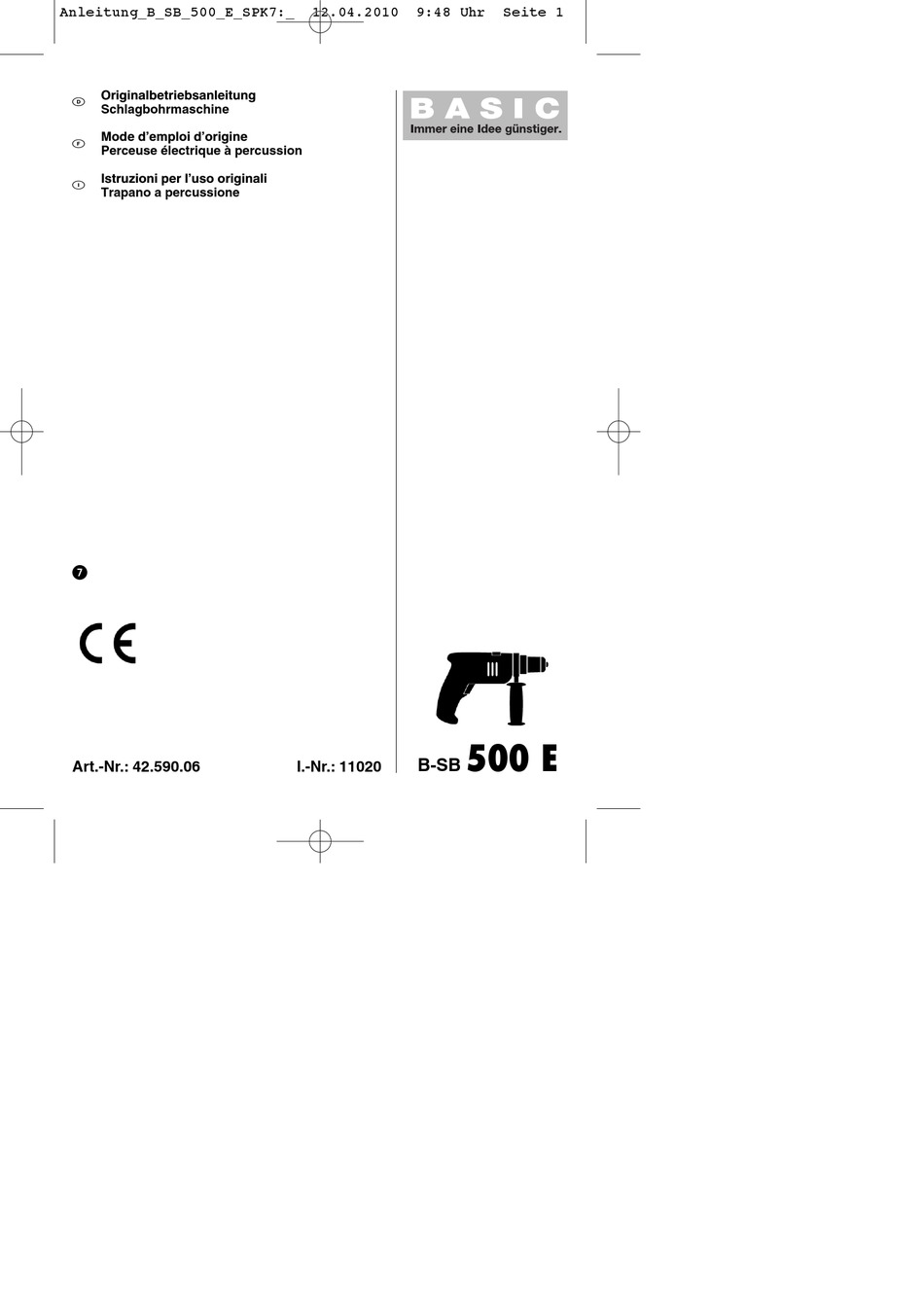Anleitung_B_SB_500_E_SPK7:_ 12.04.2010 9:48 Uhr Seite 1 Originalbetriebsanleitung Schlagbohrmaschine Mode d’emploi d’origine Perceuse électrique à percussion Istruzioni per l’uso originali Trapano a percussione 500 E B-SB Art.-Nr.: 42.590.06 I.-Nr.: 11020...