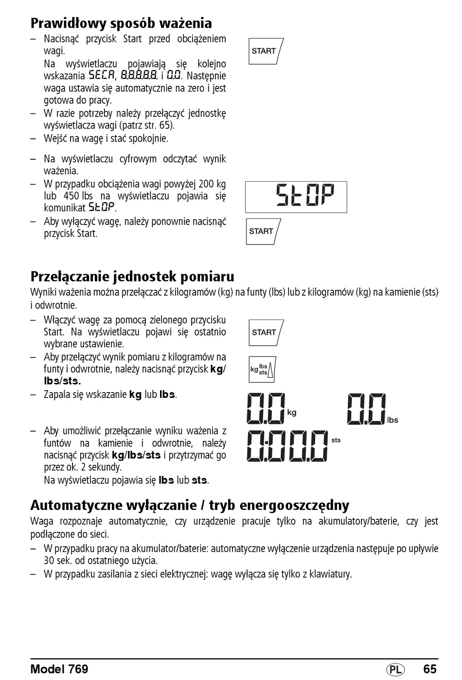 Wyniki ważenia można przełączać z kilogramów (kg) na funty (lbs) lub z kilogramów (kg) na kamienie (sts)