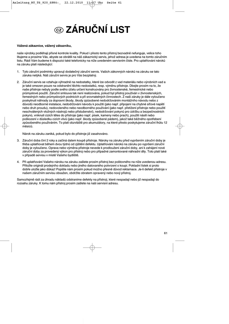 Nárok na záruku zaniká, pokud bylo do přístroje již zasahováno.