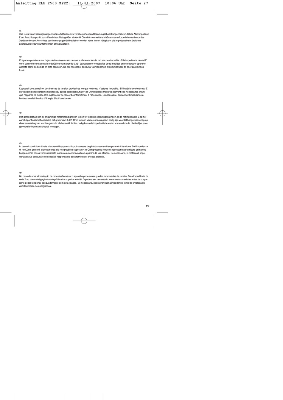 El aparato puede causar bajas de tensión en caso de que la alimentación de red sea desfavorable. Si la impedancia de red Z
