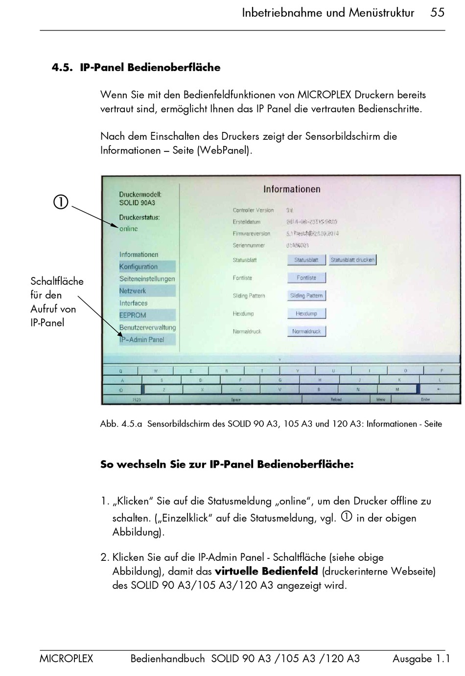 Abb. 4.5.a Sensorbildschirm des SOLID 90 A3, 105 A3 und 120 A3: Informationen - Seite