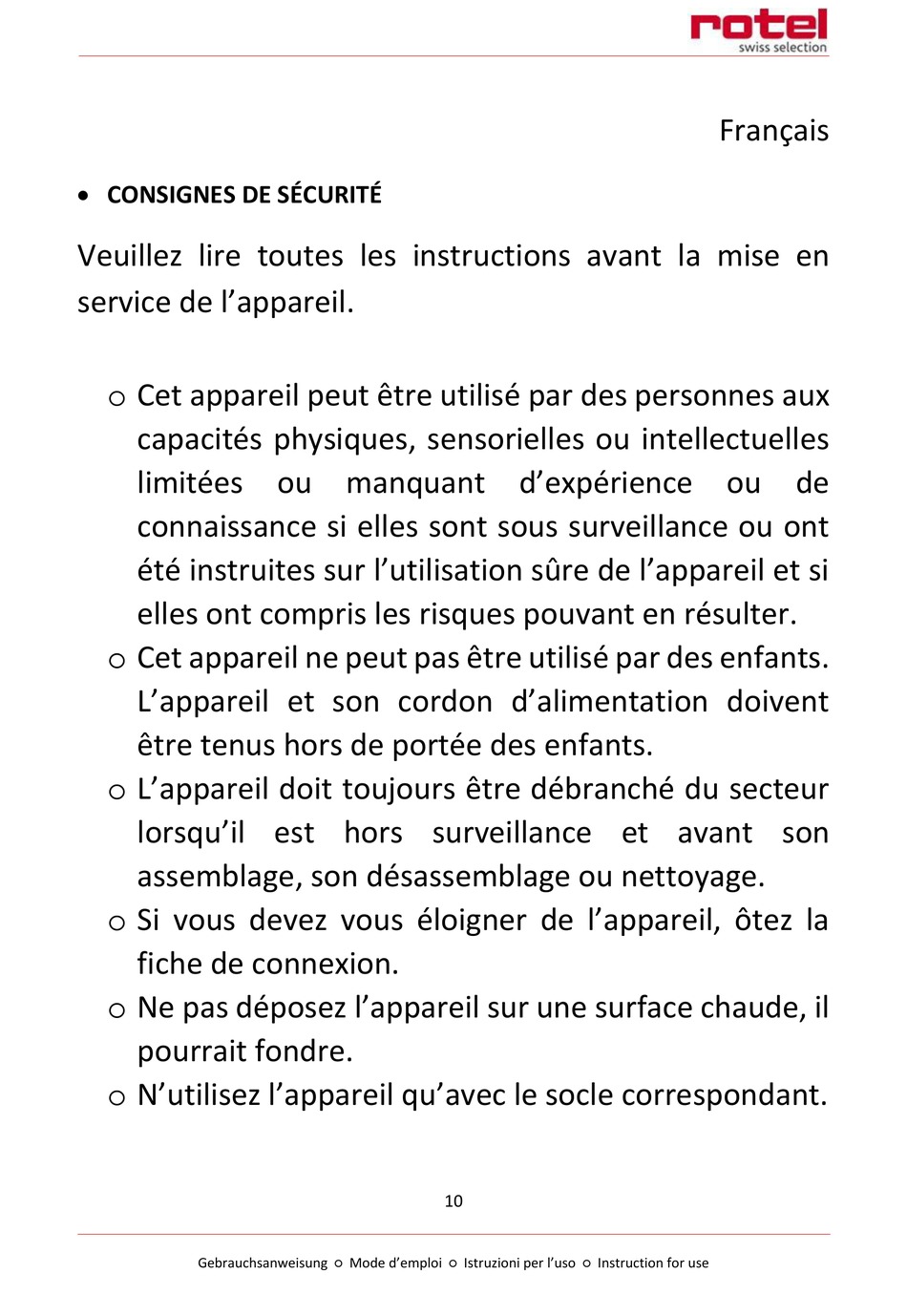 o N'utilisez l'appareil qu'avec le socle correspondant.