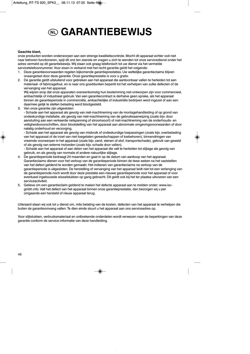 5. Gelieve om een garantieclaim geldend te maken het defecte apparaat aan te melden onder: www.isc-