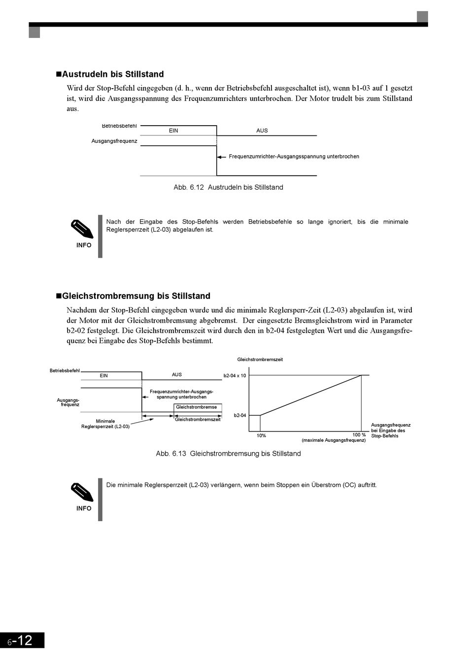 Nachdem der Stop-Befehl eingegeben wurde und die minimale Reglersperr-Zeit (L2-03) abgelaufen ist, wird