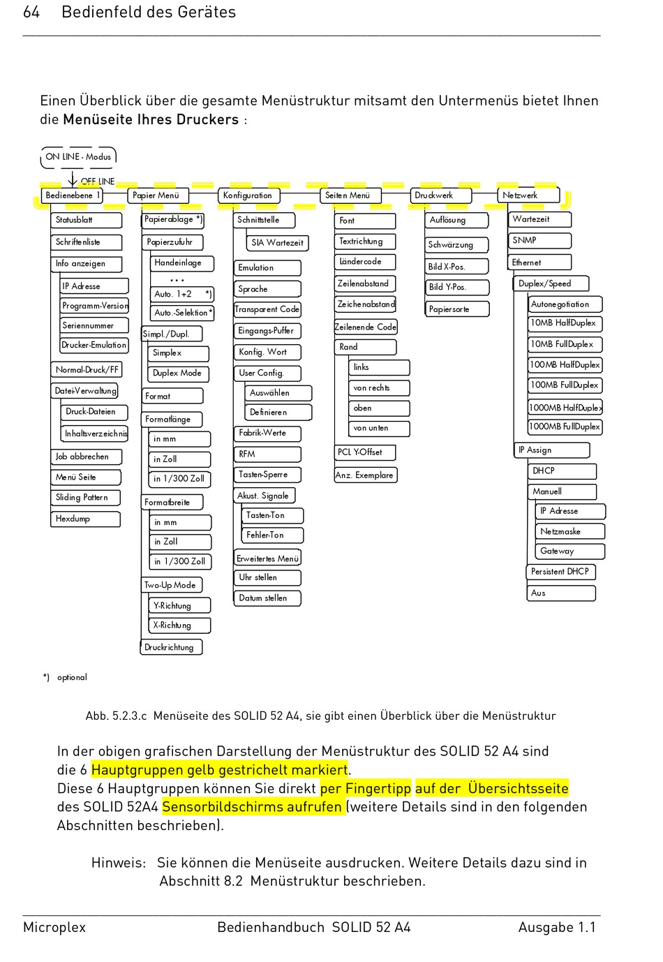 Abb. 5.2.3.c Menüseite des SOLID 52 A4, sie gibt einen Überblick über die Menüstruktur