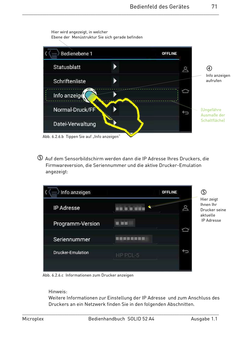 Auf dem Sensorbildschirm werden dann die IP Adresse Ihres Druckers, die