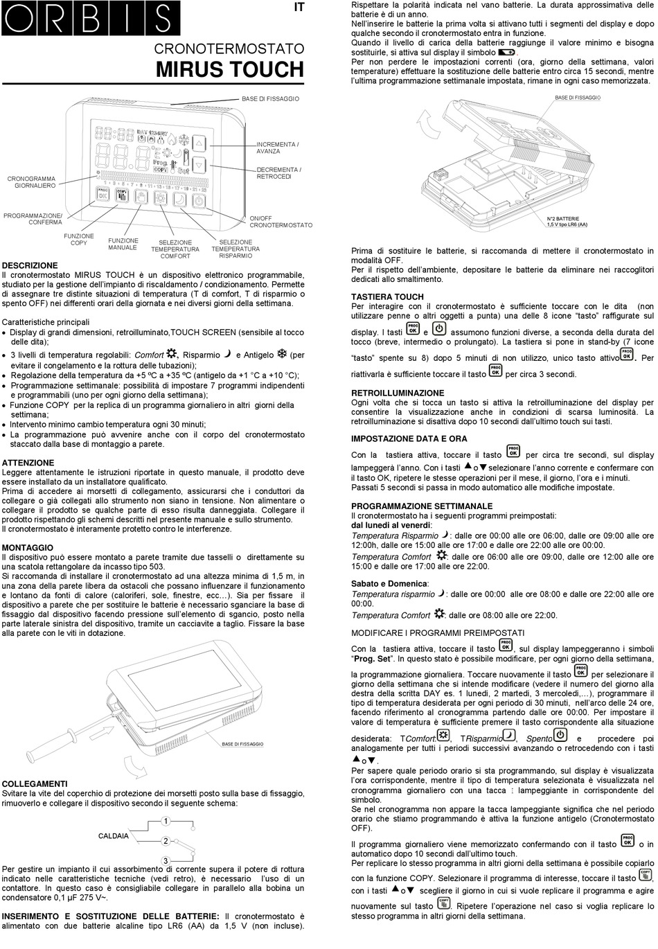 Il cronotermostato MIRUS TOUCH è un dispositivo elettronico programmabile,