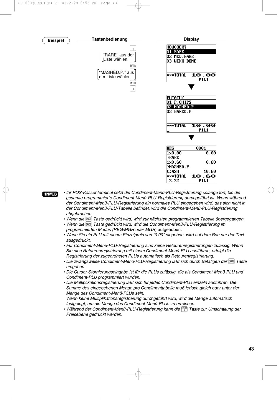 • Die Multiplikationsregistrierung läßt sich für jedes Condiment-PLU einzeln ausführen. Die