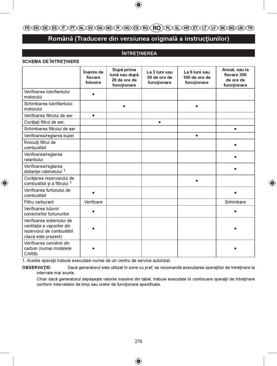 Chiar dacă generatorul depăşeşte valorile maxime din tabel, trebuie executate în continuare operaţii de întreţinere