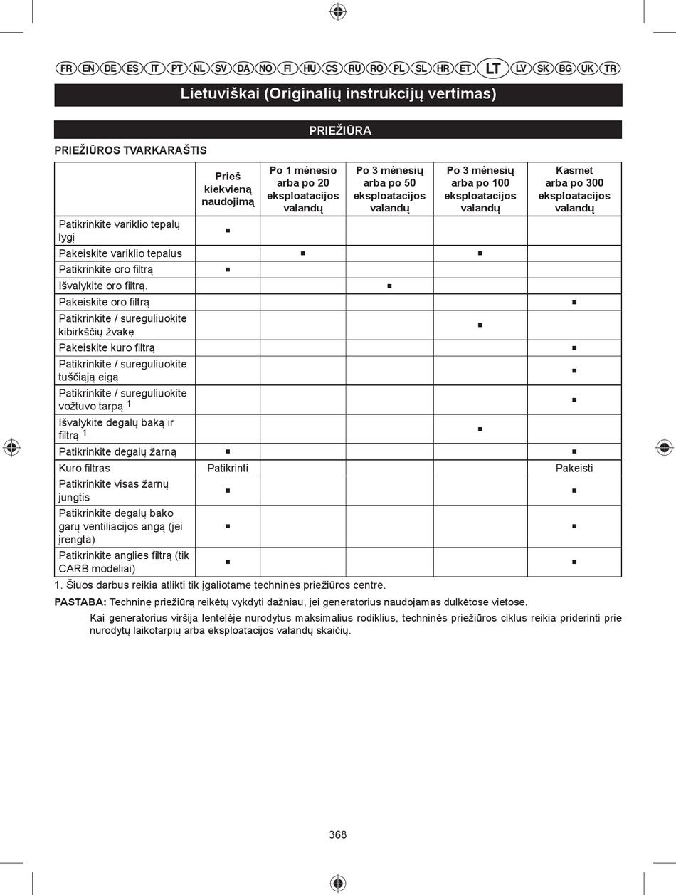 PASTABA: Techninę priežiūrą reikėtų vykdyti dažniau, jei generatorius naudojamas dulkėtose vietose.
