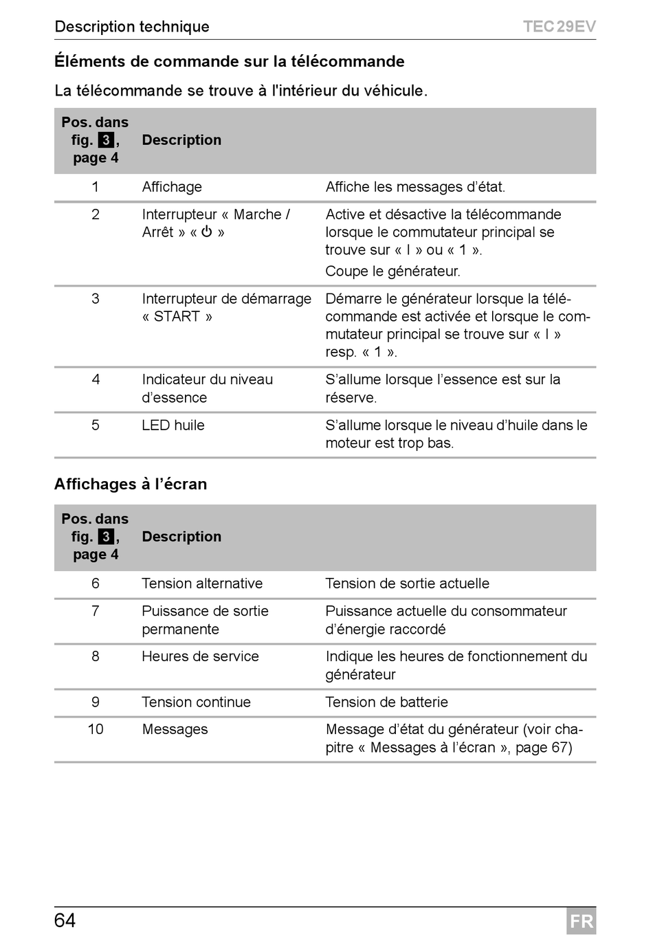 Message d'état du générateur (voir cha-