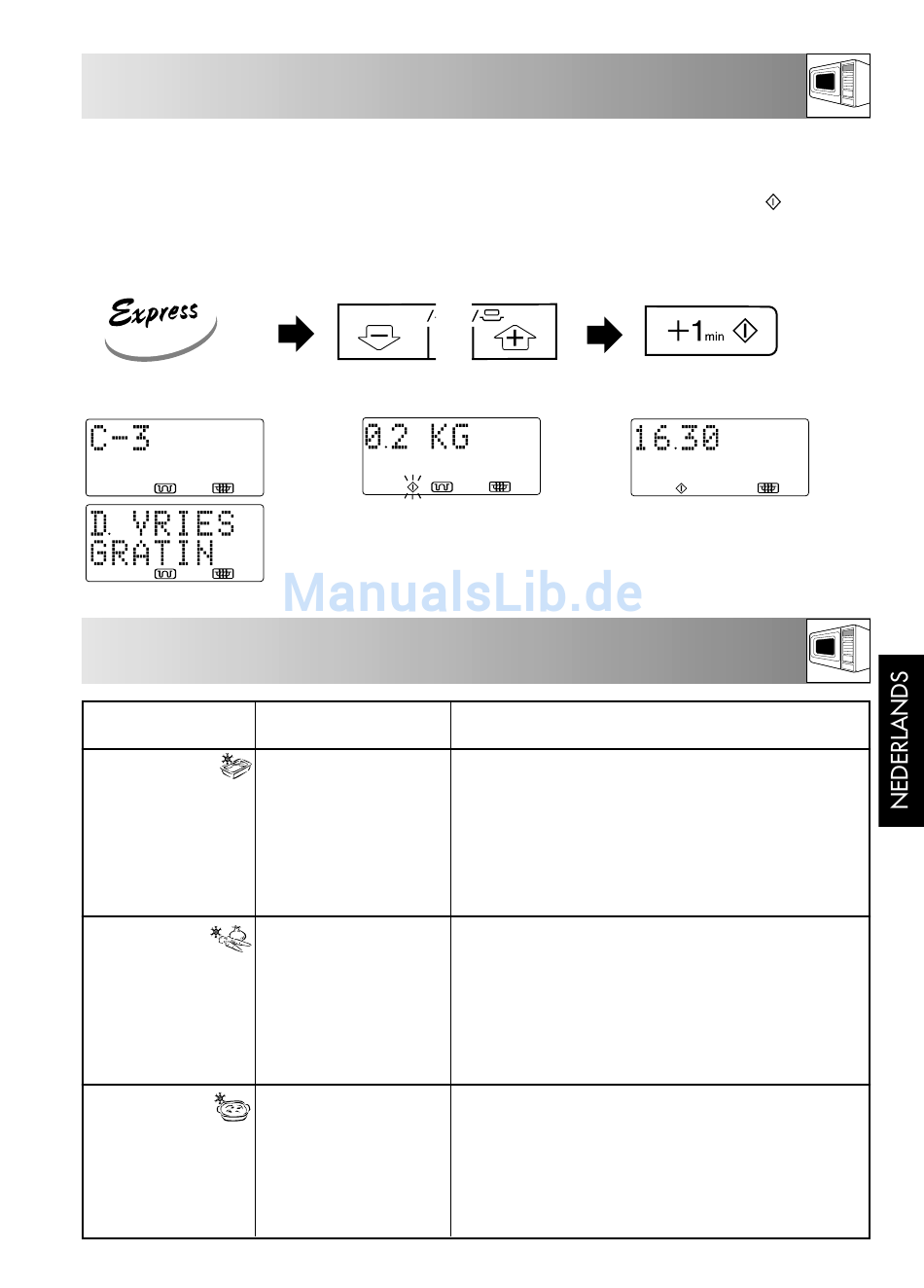 Voorbeeld: Stel dat u Diepvries-Gratin van 0,2 kg wilt koken met EXPRESS BEREIDEN.