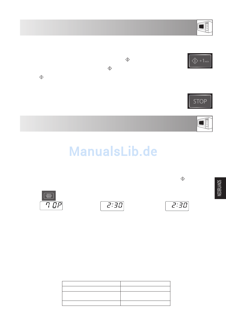 • Wanneer het koken/ontdooien is voltooid, open de deur of druk op de STOP-toets en de tijd van de dag zal