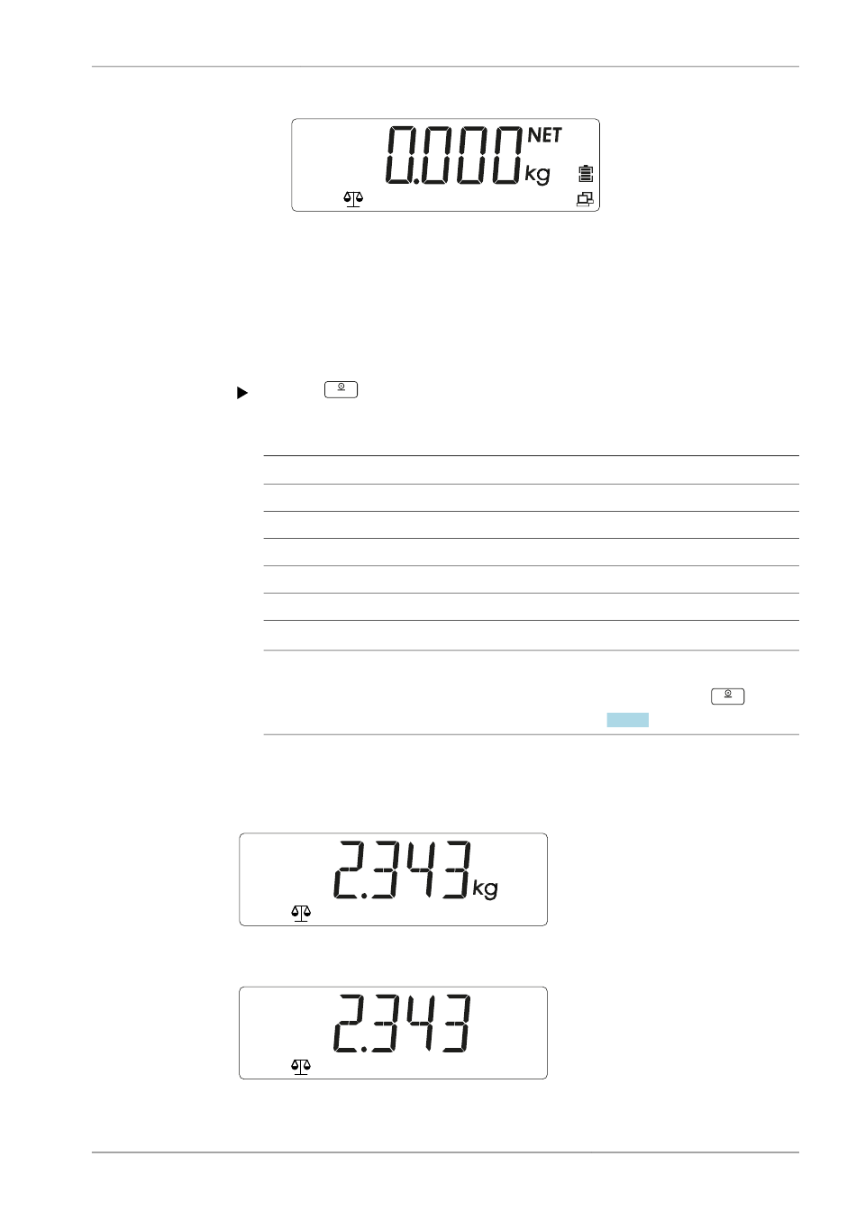 Ein stabiler Gewichtswert wird mit Einheitenzeichen angezeigt (z. B. [kg]).