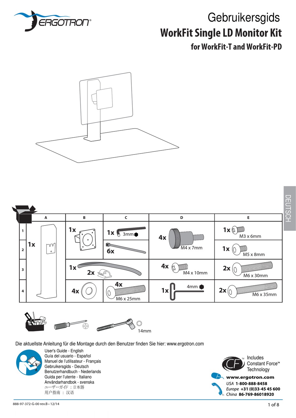 M4 x 10mm M6 x 30mm M6 x 35mm M6 x 25mm 14mm Die aktuellste Anleitung für die Montage durch den Benutzer fi nden Sie hier: www.ergotron.com User's Guide - English Guía del usuario - Español Includes Manuel de l’utilisateur - Français Constant Force™...