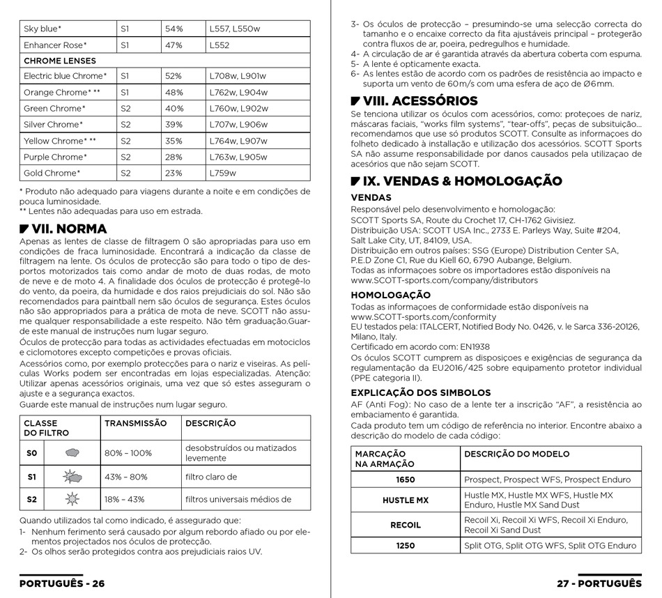 Os óculos SCOTT cumprem as disposiçoes e exigências de segurança da