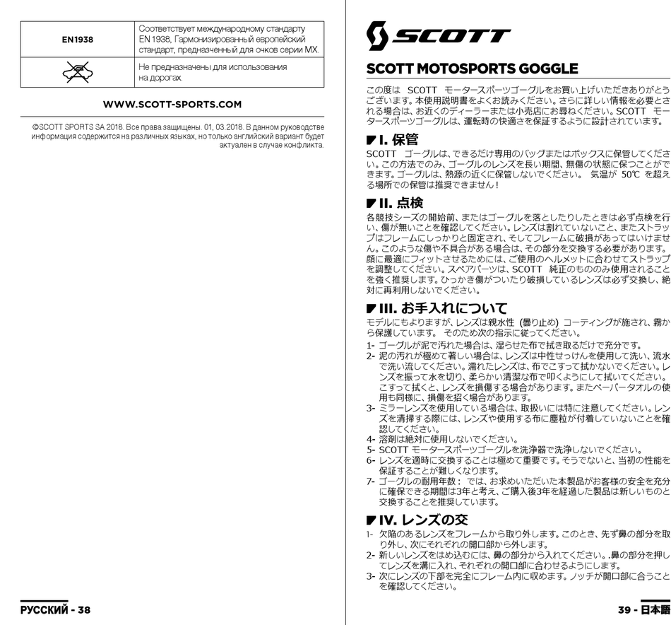 この度は SCOTT モータースポーツゴーグルをお買い上げいただきありがとう