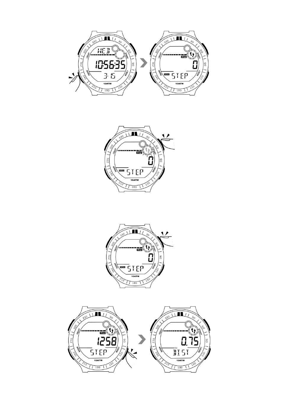 6.1 In the time display mode, press the mode button once to enter into pedometer mode.