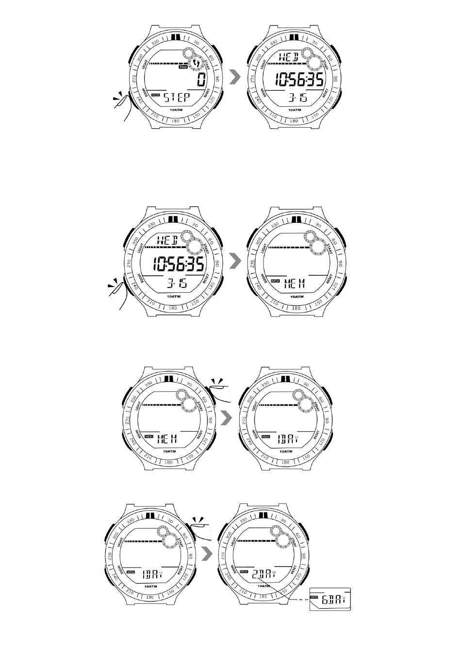 7.1 In the time display mode, press the mode button for 4 times to enter into the memory mode.