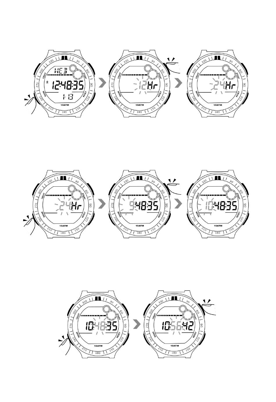 2.1 In the time display mode, hold down the mode button till you see the digit for the hours format starts