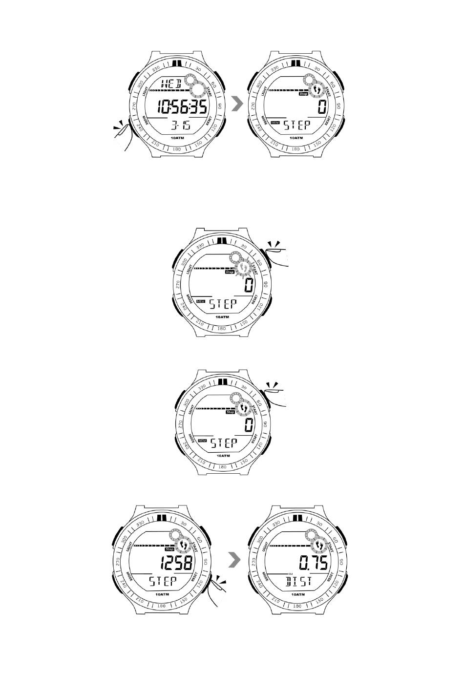 6.1 Drücken Sie im Zeitanzeigemodus die Modustaste einmal, um in den Schrittzählermodus zu wechseln.