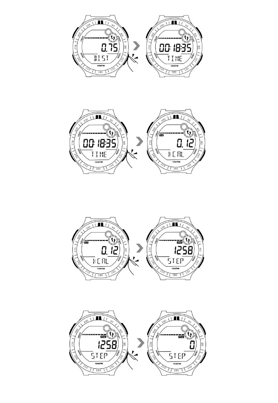 6.6 Appuyez à nouveau sur le bouton de réinitialisation pour revenir au comptage des pas en temps réel.