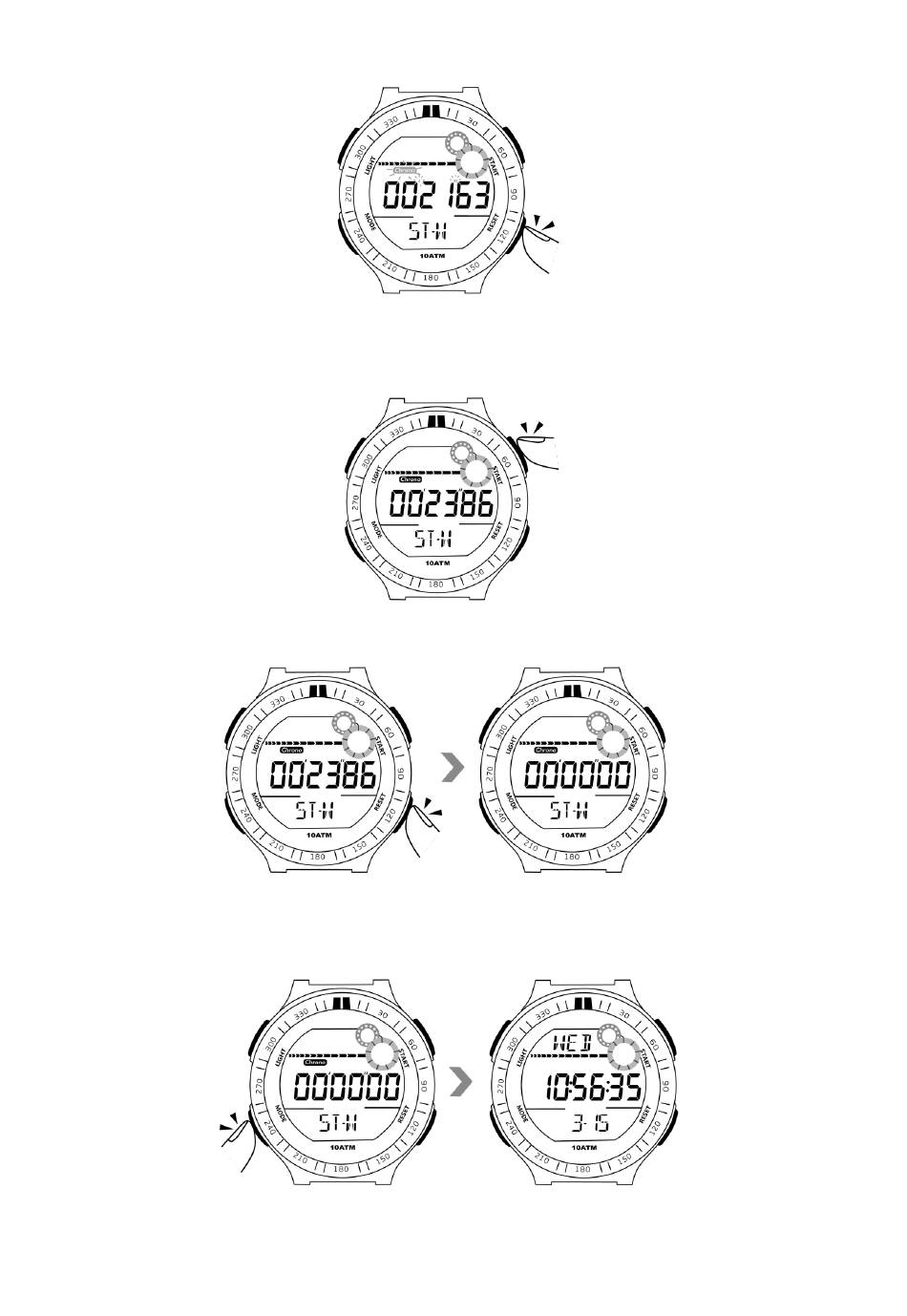 3.5 Premere una volta il pulsante di reset per mostrare il 2 ° giro letto, l'indicatore del cronografo inizia a