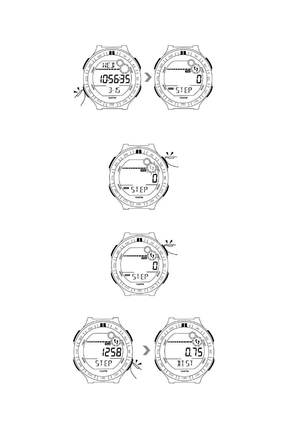 6.2 Premere una volta il pulsante di avvio per avviare il conteggio dei passi, l'indicatore del contapassi