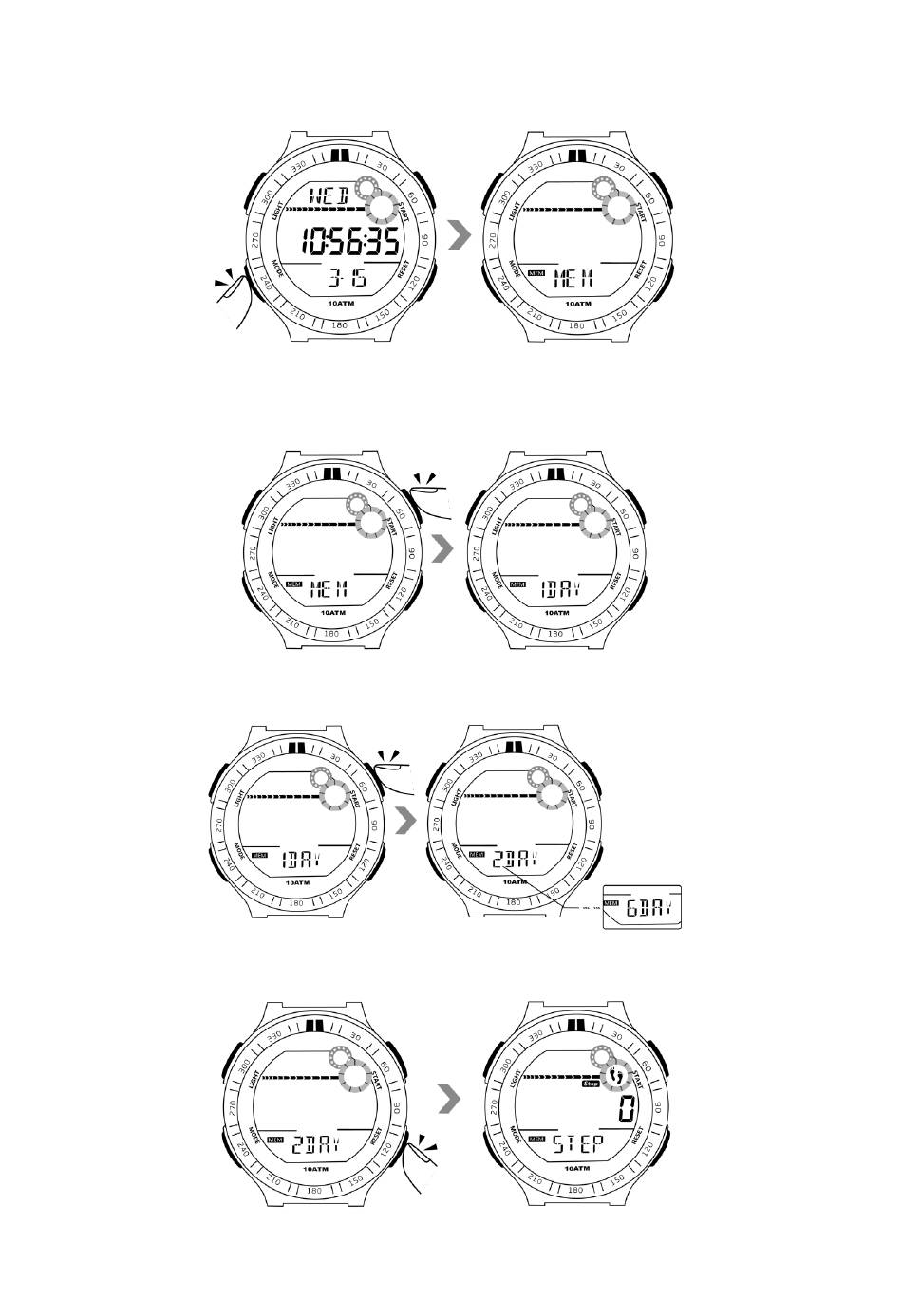 7.1 En el modo de visualización de la hora, presione el botón de modo 4 veces para ingresar al modo de