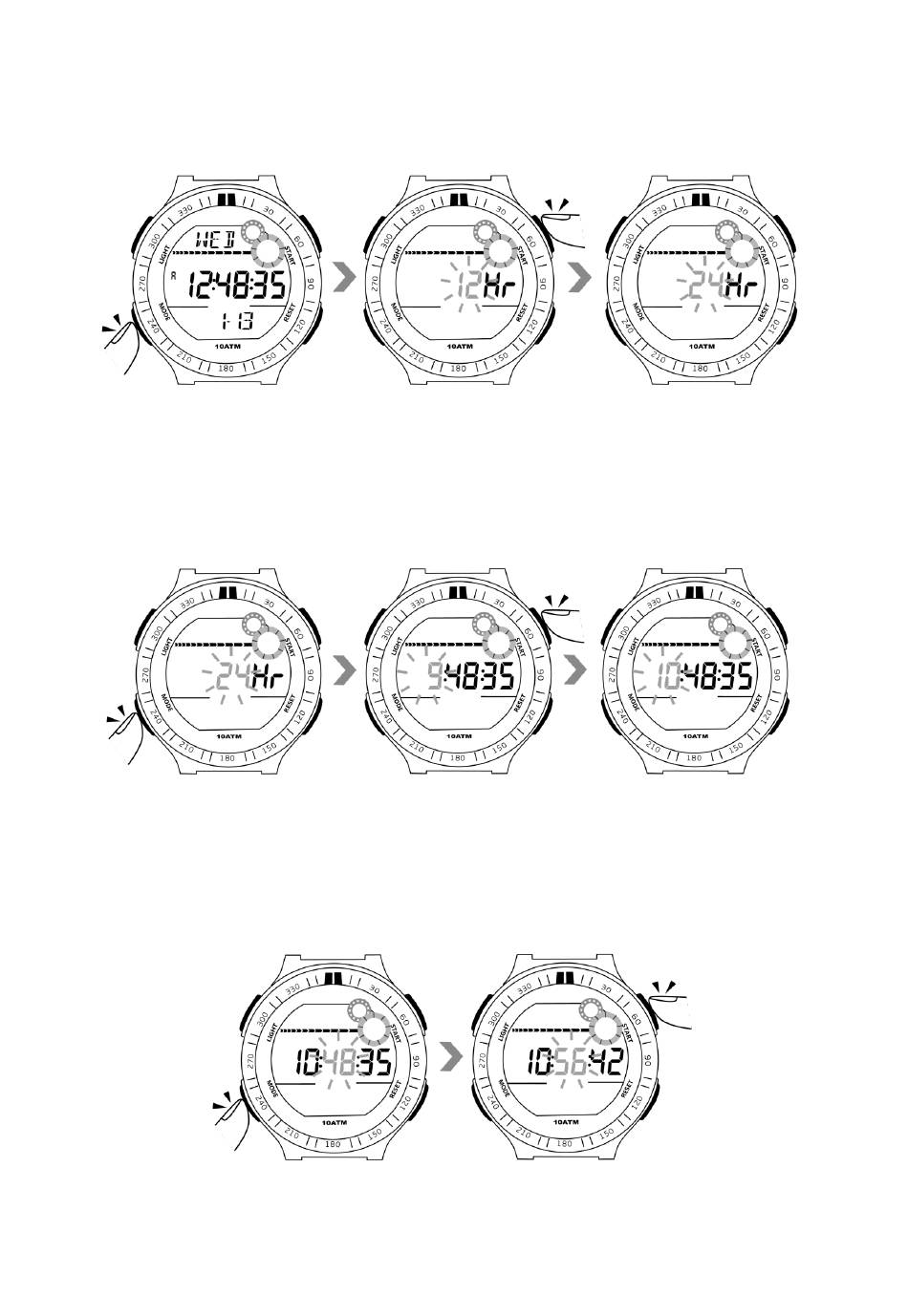 2.1 時間表示モードで、時間形式の数字が点滅し始めるまでモードボタンを押し続けてから、開始