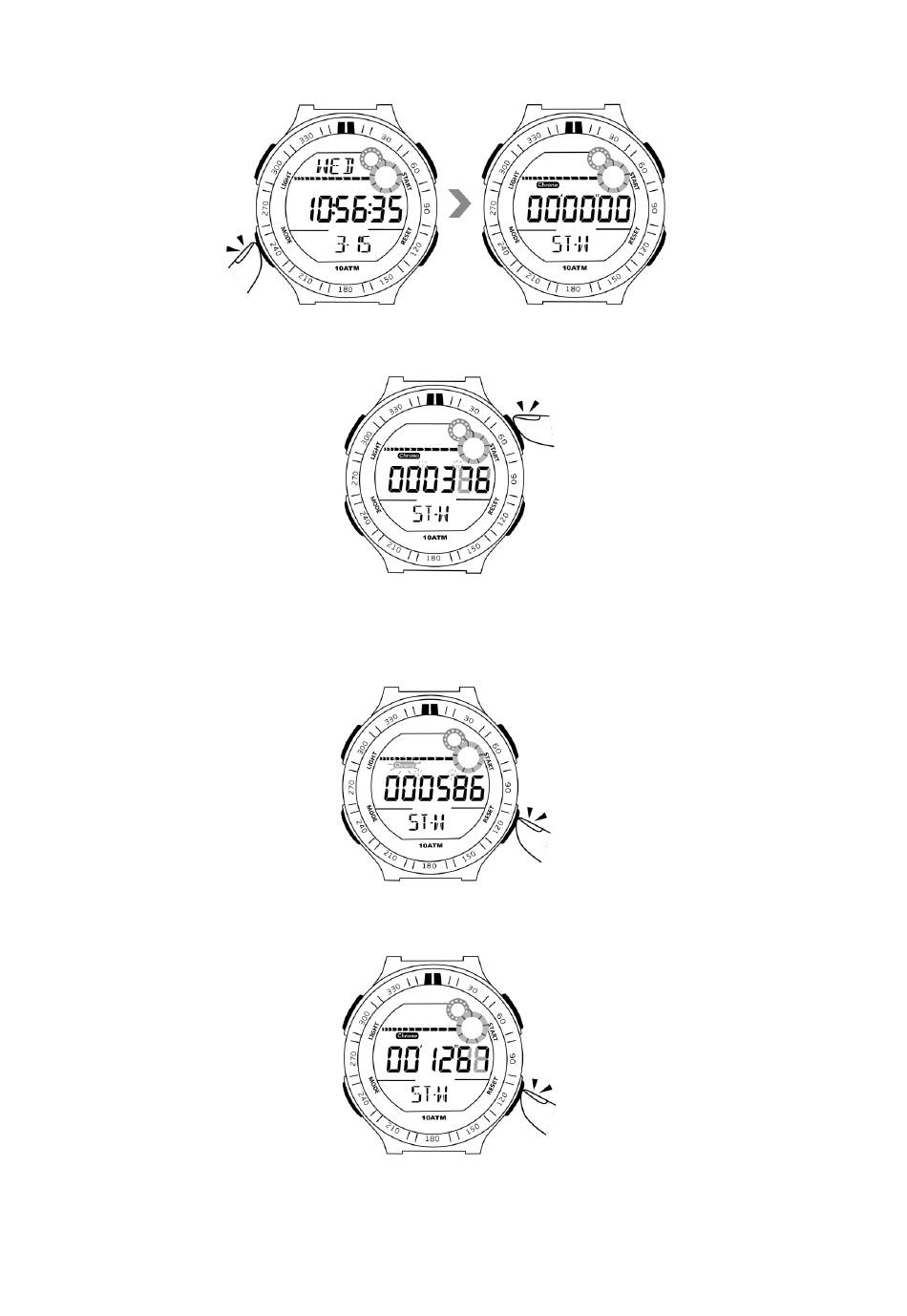 3.1 時間表示モードで、モードボタンを 2 回押して、ラップストップウォッチモードに入ります。