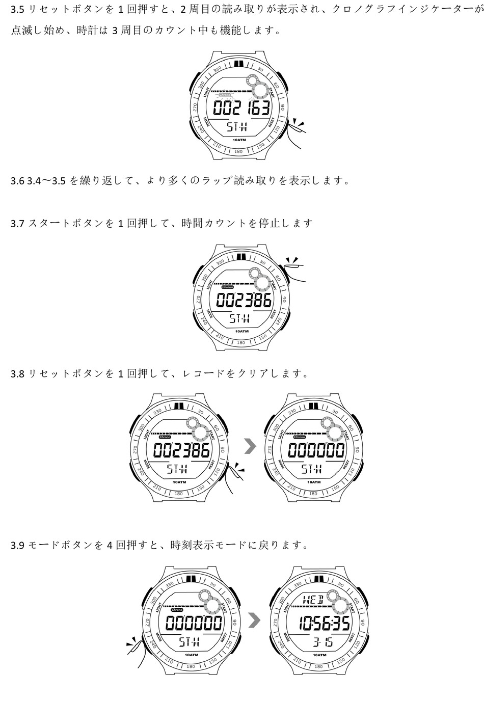 3.5 リセットボタンを 1 回押すと、2 周目の読み取りが表示され、クロノグラフインジケーターが