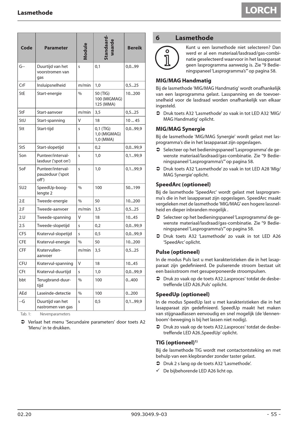 wenste materiaal/lasdraad/gas-combinatie. Zie "9 Bedie-