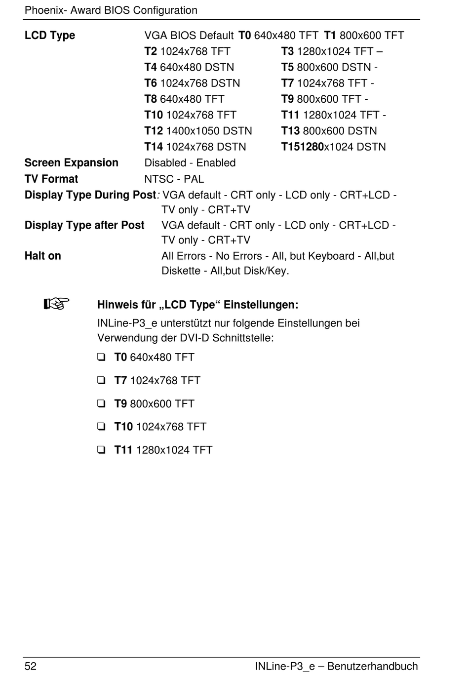 INLine-P3_e unterstützt nur folgende Einstellungen bei