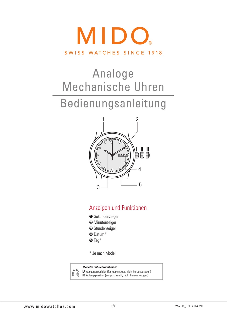 Analoge Mechanische Uhren Bedienungsanleitung Anzeigen und Funktionen Sekundenzeiger Minutenzeiger Stundenzeiger Datum* Tag* * Je nach Modell Modelle mit Schraubkrone: IA Ausgangsposition (festgeschraubt, nicht herausgezogen) IB Aufzugsposition (aufgeschraubt, nicht herausgezogen) w w w. m idow atche s. co m 257- B_DE / 04.20...