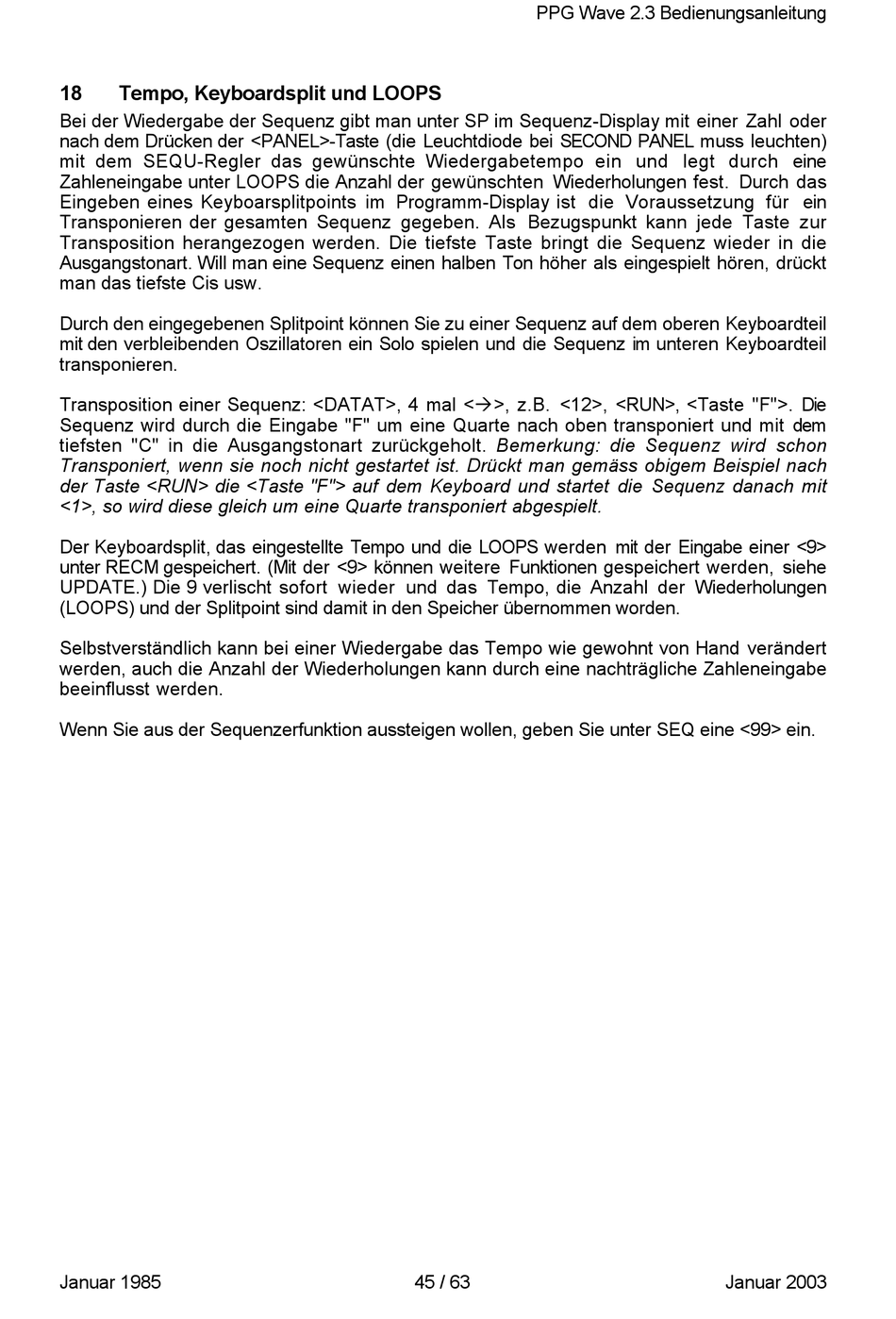 Transposition einer Sequenz: <DATAT>, 4 mal <‡>, z.B. <12>, <RUN>, <Taste "F">. Die