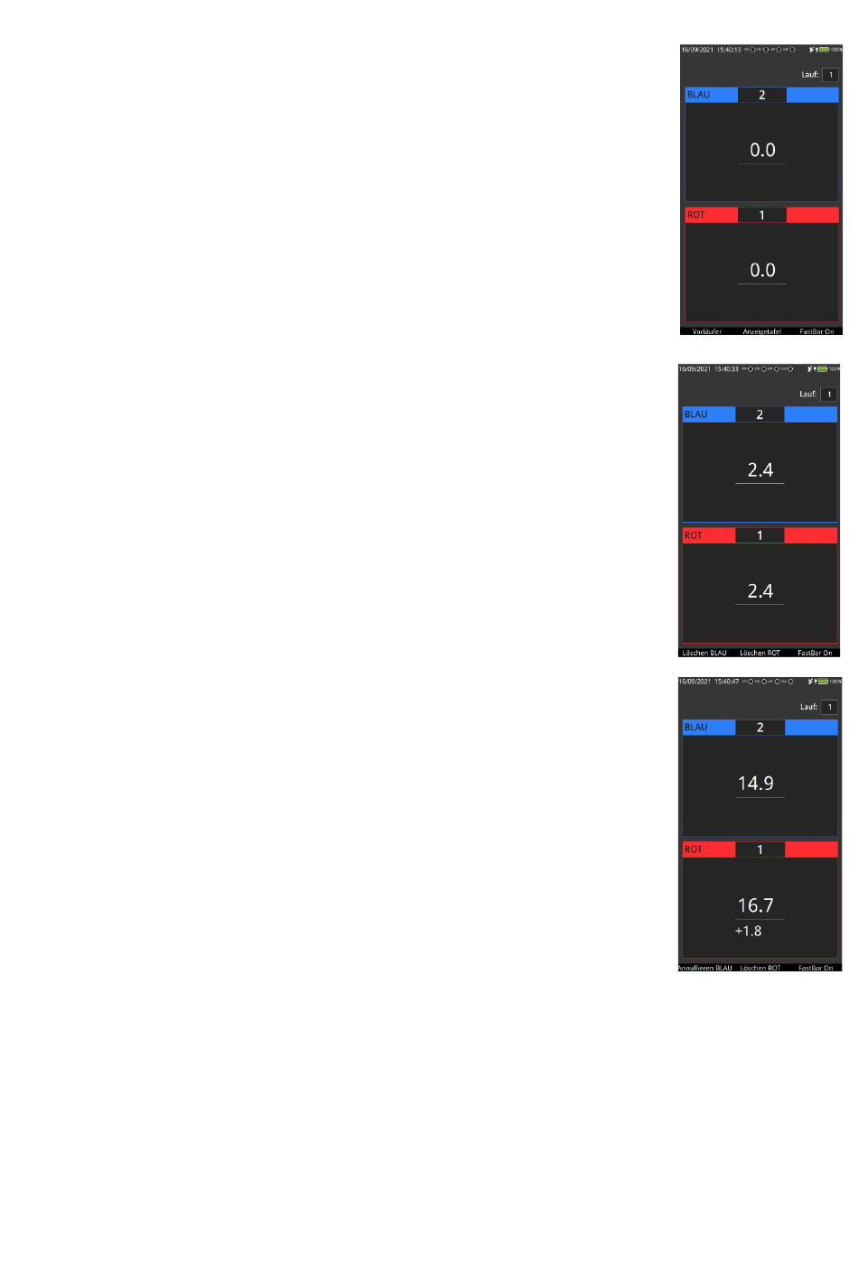 Nach Empfang der Stoppimpulse von beiden Bahnen erscheinen die beiden Zeiten