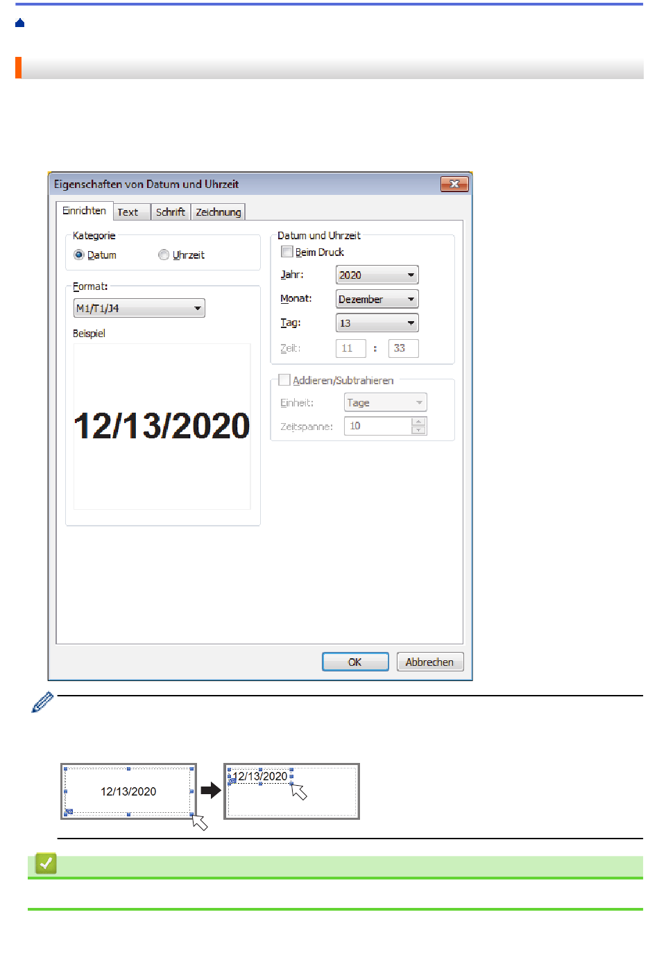Das auf dem Etikett eingefügte Datum und die Uhrzeit werden in der Standard-Zeichengröße des Druckers