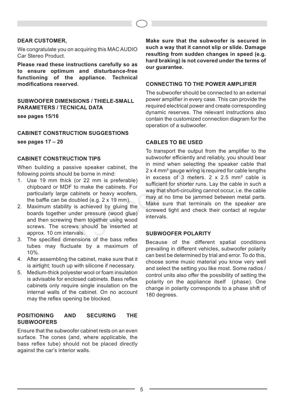 Subwoofer MAC Audio SX 10 Bedienungsanleitung/Garantiekunde