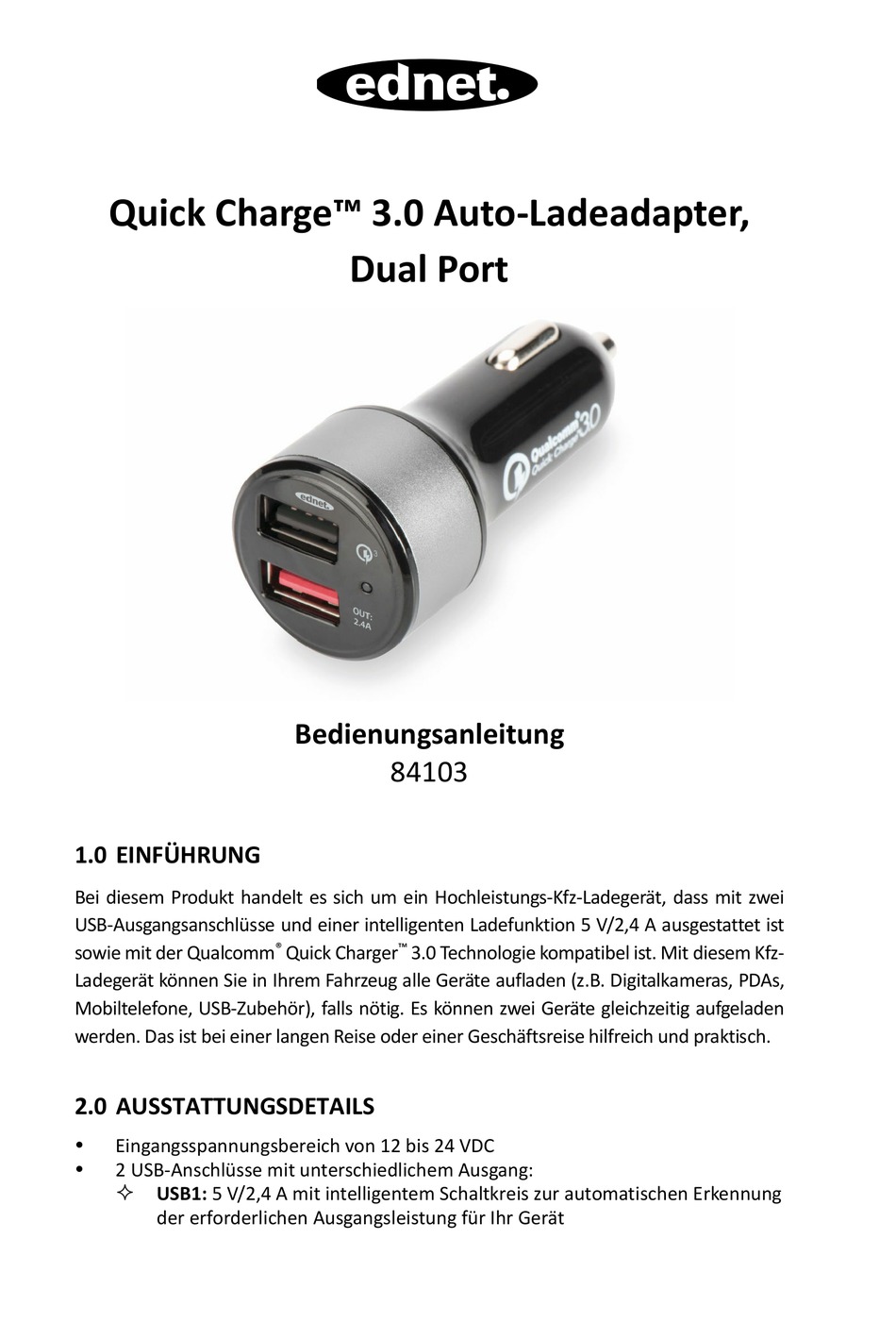 Quick Charge™ 3.0 Auto-Ladeadapter, Dual Port Bedienungsanleitung 84103 1.0 EINFÜHRUNG Bei diesem Produkt handelt es sich um ein Hochleistungs-Kfz-Ladegerät, dass mit zwei USB-Ausgangsanschlüsse und einer intelligenten Ladefunktion 5 V/2,4 A ausgestattet ist sowie mit der Qualcomm Quick Charger 3.0 Technologie kompatibel ist. Mit diesem Kfz- ®...