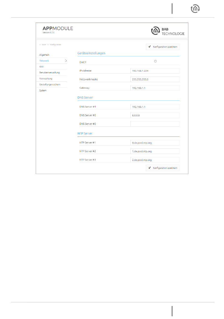 Sie auf „Konfiguration speichern". Der Server im Gerät wird neu gestartet, der Browser verbindet sich