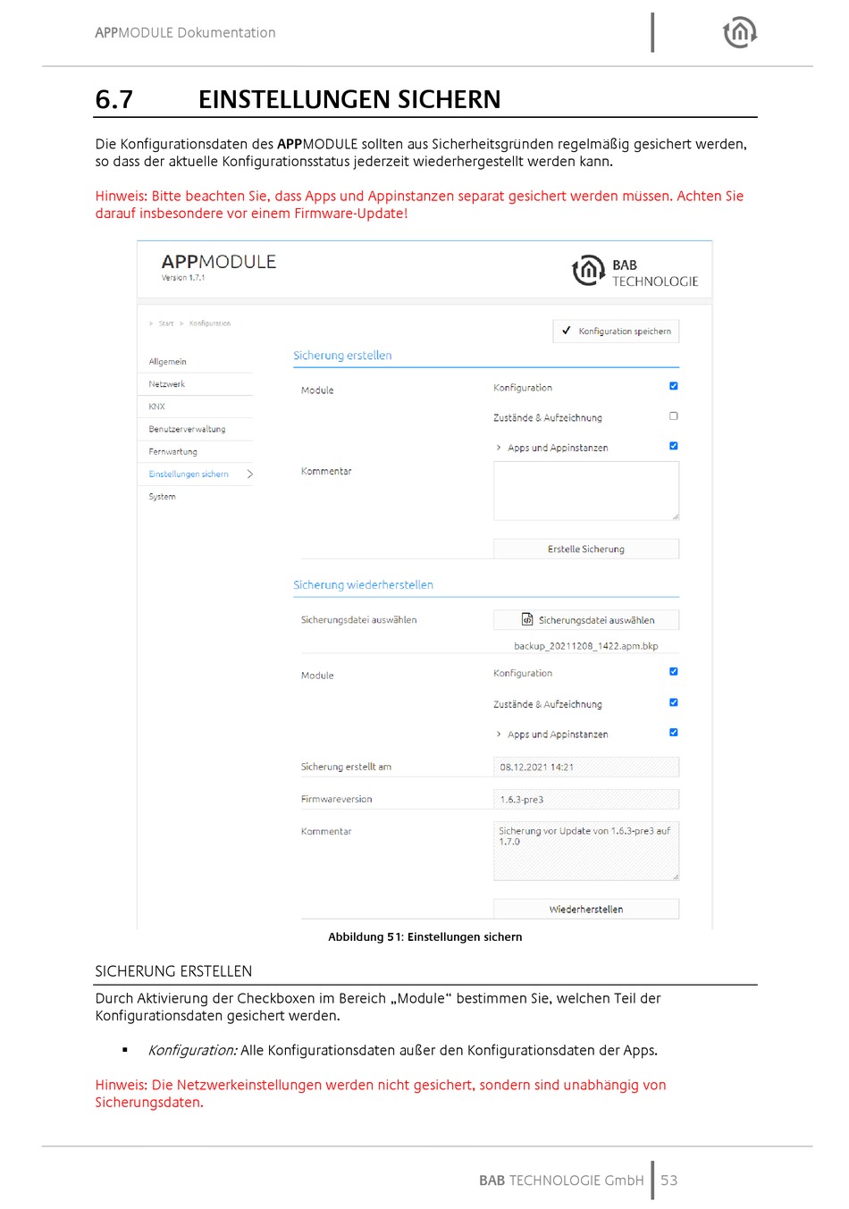 Die Konfigurationsdaten des APPMODULE sollten aus Sicherheitsgründen regelmäßig gesichert werden,